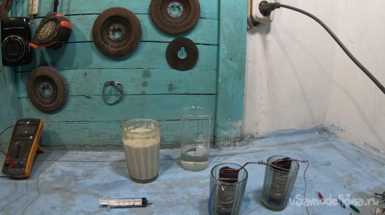 Спустя пару часов, а лучше оставить на ночь, сверху образуется прозрачная жидкость. Эту жидкость собираем шприцом или аккуратно сливаем, это и будет наш реактив. Уже в таком состоянии он неплохо растворяет оксидную пленку алюминия, и выделяются пузырьки водорода.