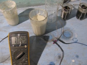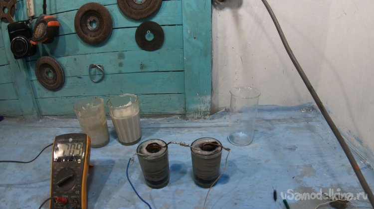 Сразу после заливания электролита напряжение составило 2.2В, а ток при коротком замыкании не менее 300 мА. От такой батареи запускается моторчик от игрушки.