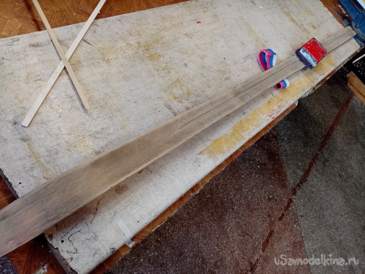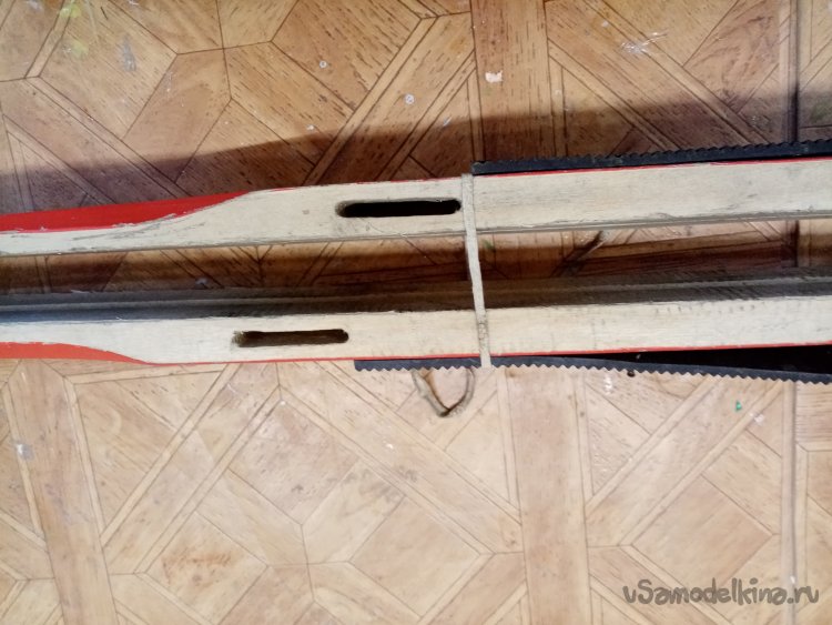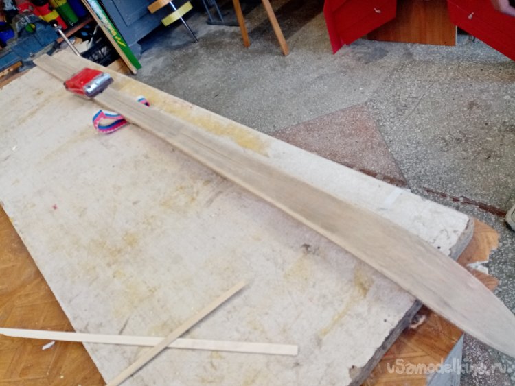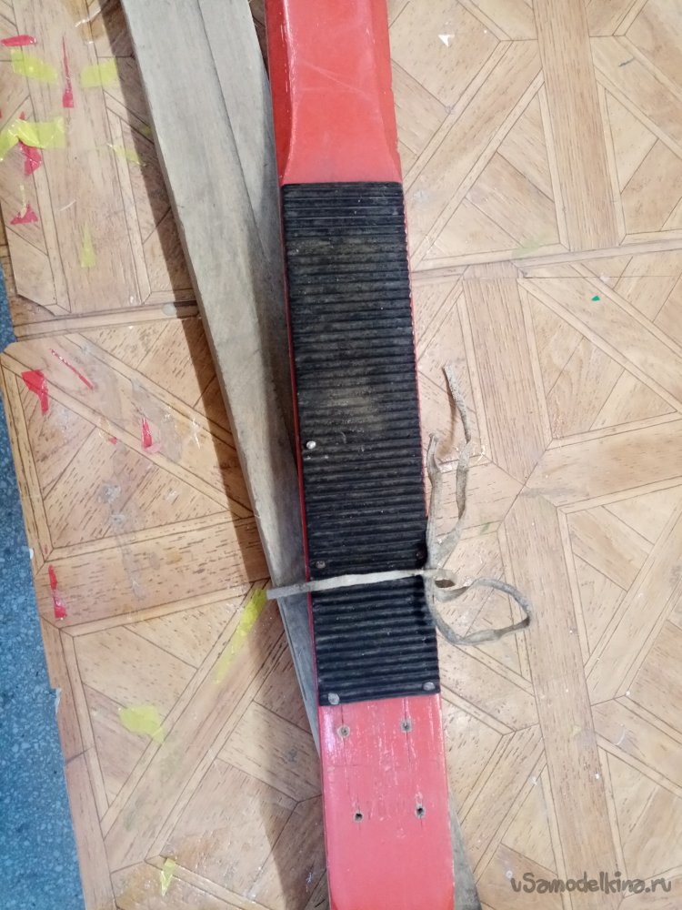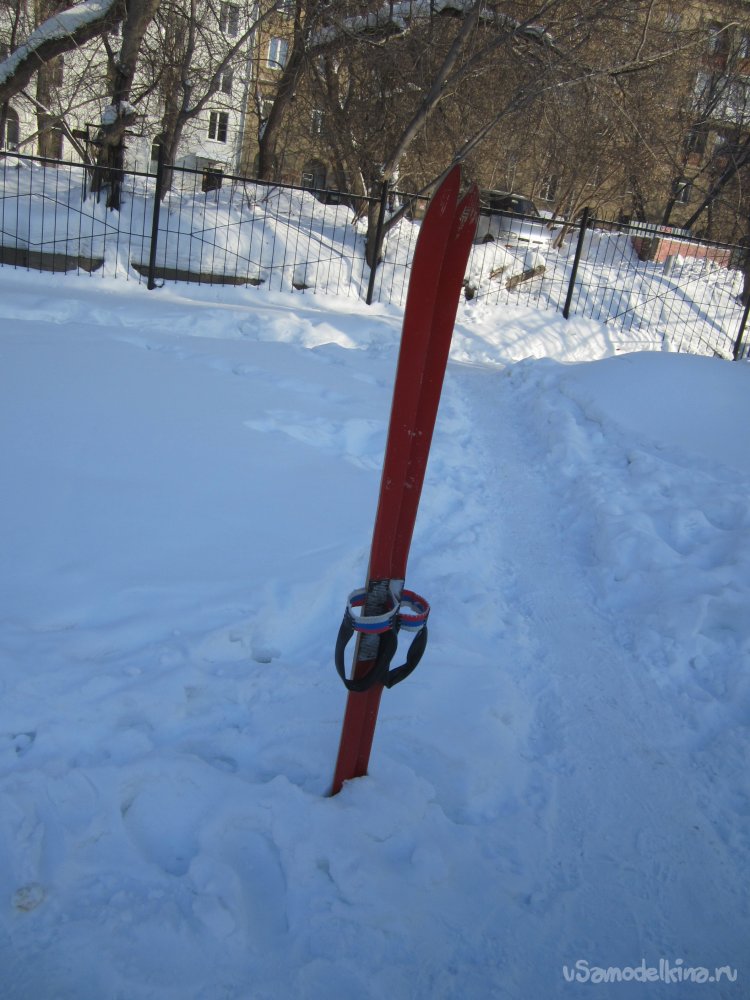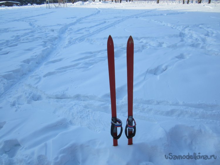И как то нам повезло, нашлись старые лыжи. И весьма удачной конструкции с вырезанным пазом под ремень крепления. Но самой «обвязки» уже давно нет в наличие.