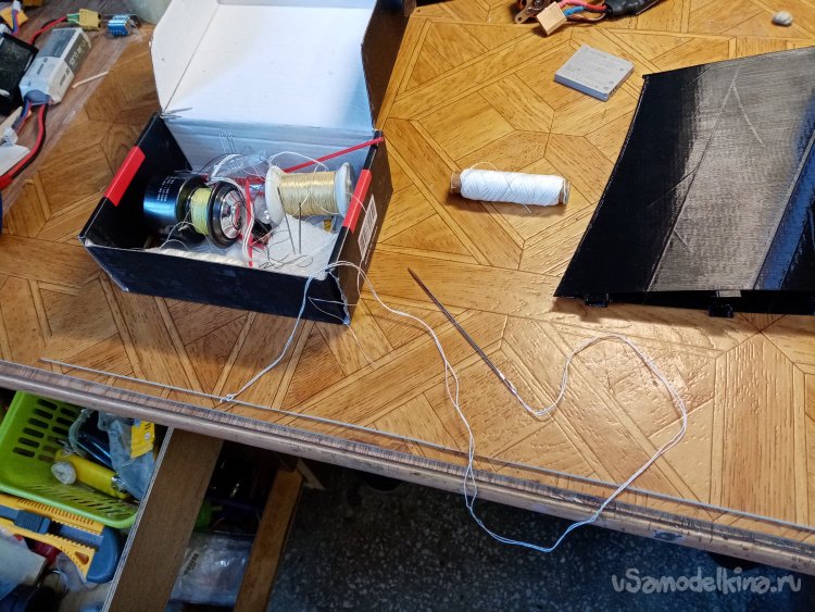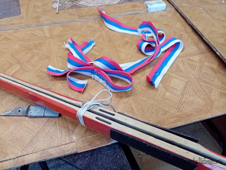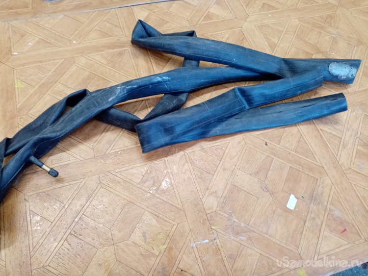 Пробные испытания показали некоторую недоработку. Нога хлябала в петле крепления. Идти даже по прямой было не просто. Нужно установить еще один фиксатор ноги. На выручку пришла старая камера от велосипеда. Отрезки от которой мы используем для раздувки при изготовлении фюзеляжей и хвостовых балок.