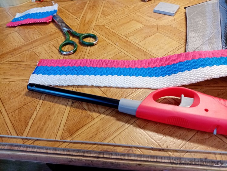 Отрезаю распушенный конец ремня. Все сыпется со страшной силой. Сплошная синтетика. Но это и хорошо значит прочный, уж если на нем машину таскали. Заплавляю конец при помощи зажигалки. Теперь все нормально прочно и не сыпется.