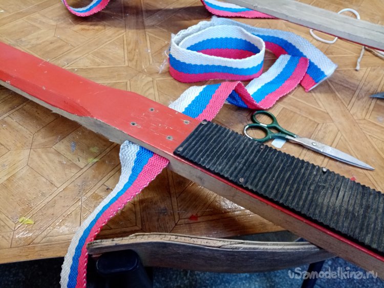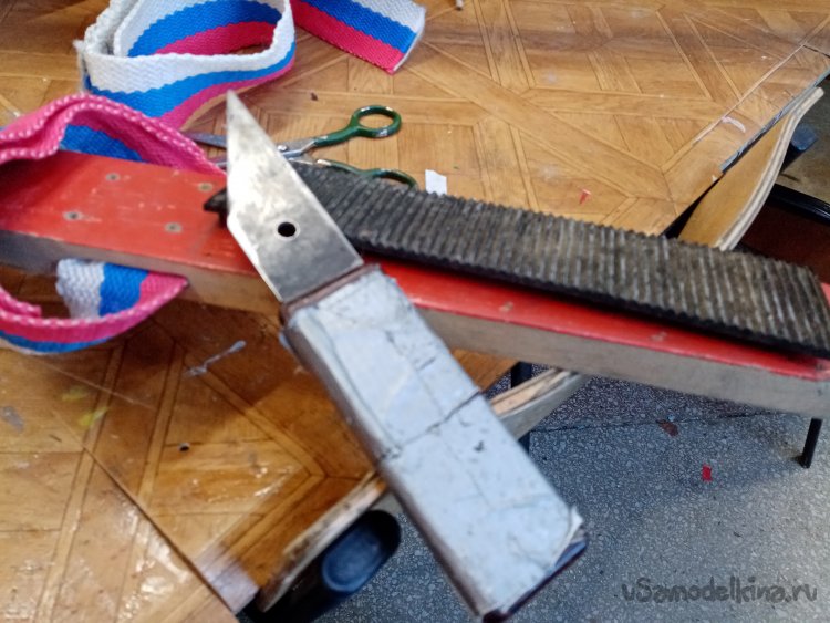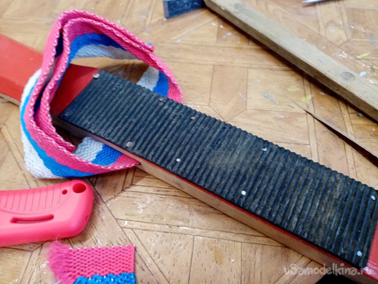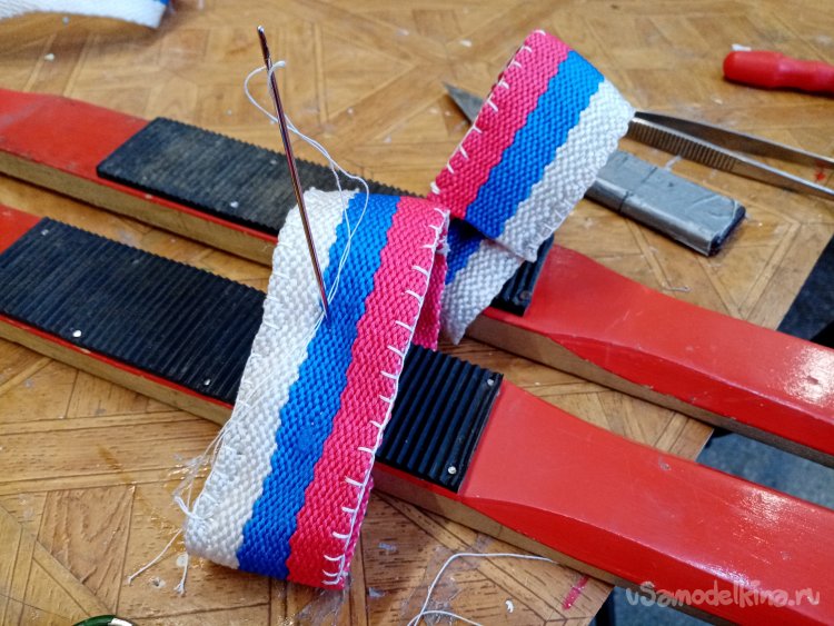 Ремни пришиты. Нужно немного поправить скользящую часть лыж. Использую утюжок с некрупной шкуркой.