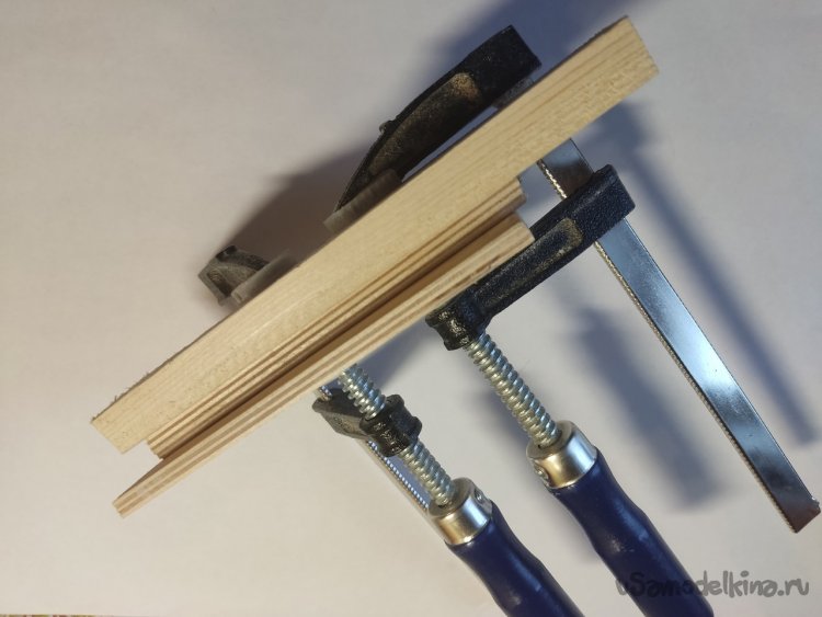 Параллельно этой линии проводим с внутренней стороны точно такую же линию, отступив 5 мм . К получившейся линии прикладываем фанерку (140-55-8), поверх неё кладем брусок , его мы ровняем по первой линии , фиксируем конструкцию намертво струбцинами и вуаля , приспособа готова , можно клеить не боясь .