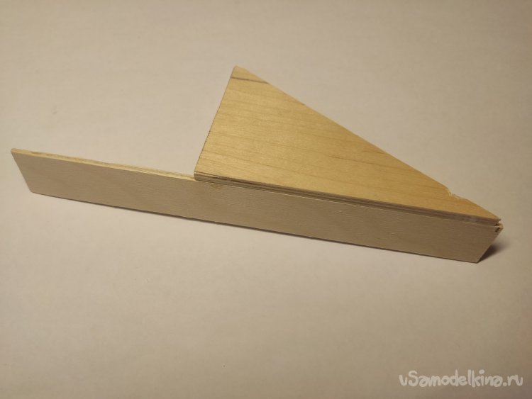 4) можно переходить к склеиванию. Намазываем, край треугольного основания и прикладываем боковину (прямоугольник 240-30-4). Ждем некоторое время, пока высохнет, после разбираем временную конструкцию.