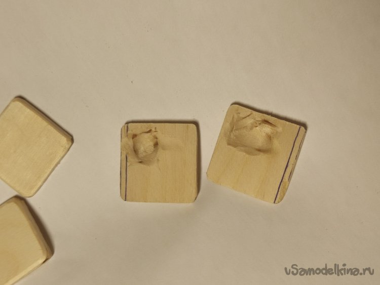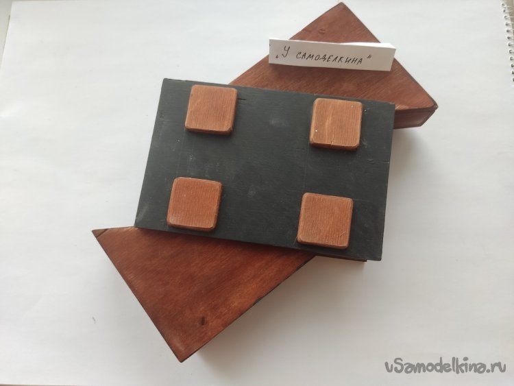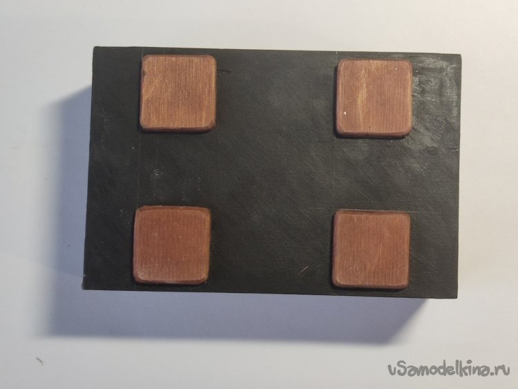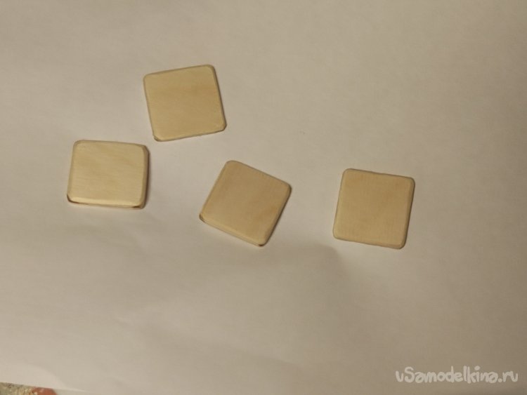 17 . Из обрезков от боковин треугольных оснований сделаем ножки. Они представляют из себя 4 квадратика с размерами 30-30-4 мм , когда выпилили все ножки, выравниваем края наждачкой и гравером снимаем фаски , которые также проходим наждачкой.