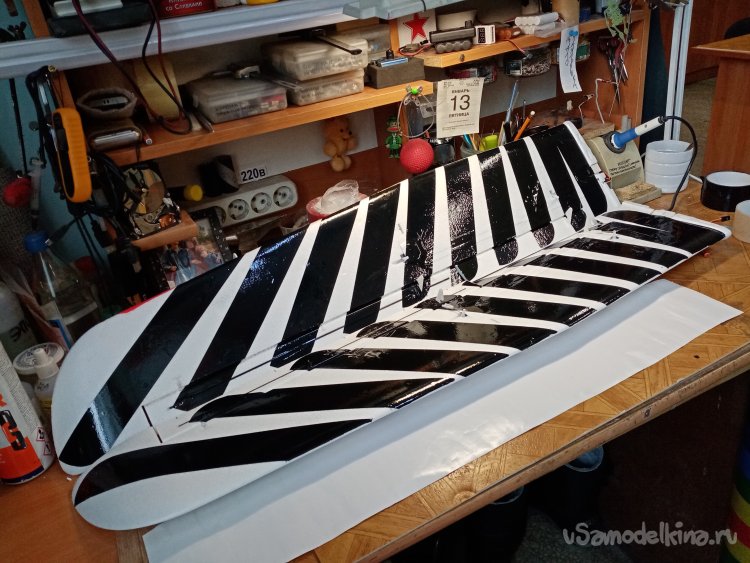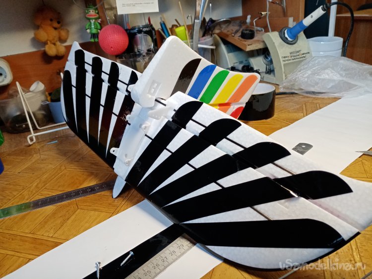 Оклеил нижнюю поверхность крыла черными «перышками», расположив их веером. При приклеивании отгиба. Флаперон и элерон для приклейки полоски встык поверхностей.