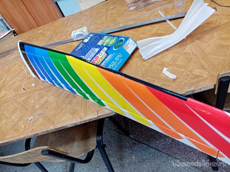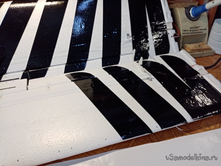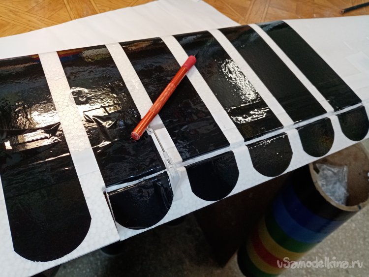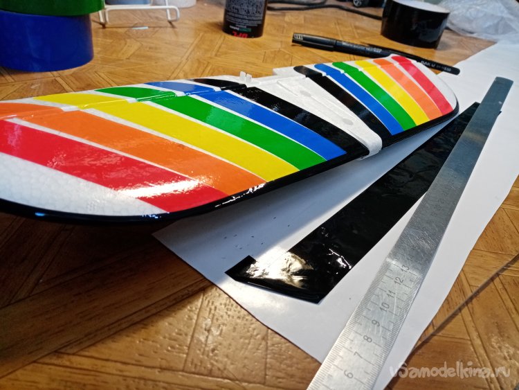 Как писал выше, при приклейке отгибаю рулевую поверхность вниз и приклеиваю полоски на перегиб формы. Получилось красиво и цельно.