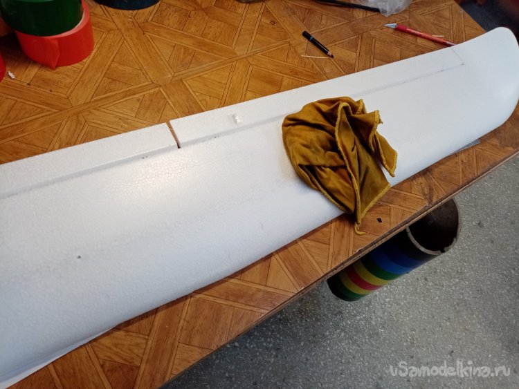 Заклеиваю на нижней плоскости крыла каналы для прокладки проводов управления к сервоприводам. Сейчас поверхность равномерно белая без всяких некрасивых полос.