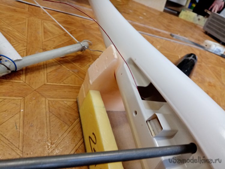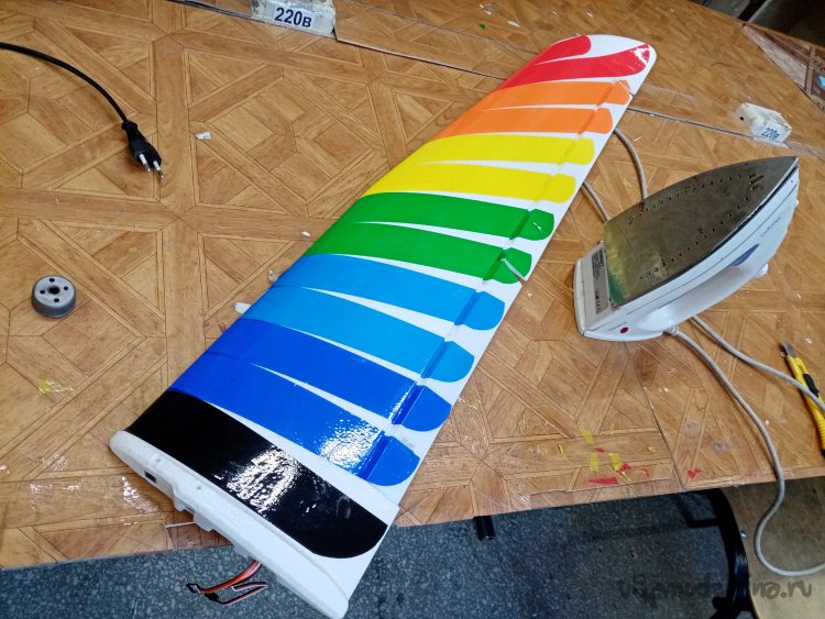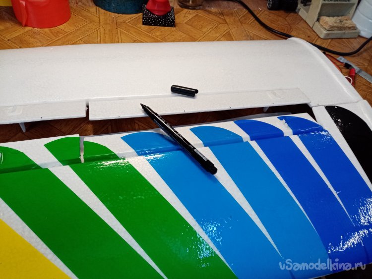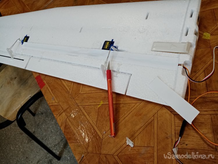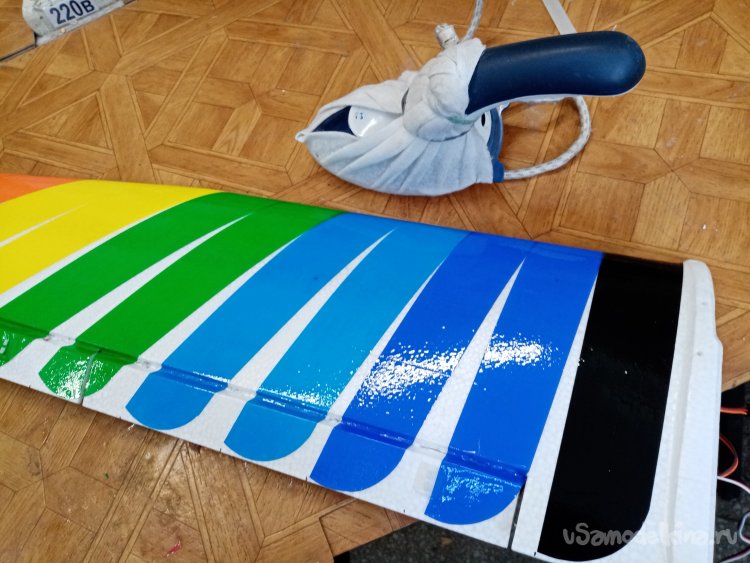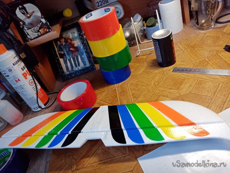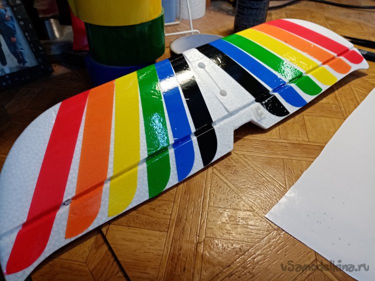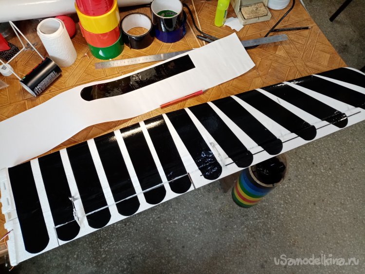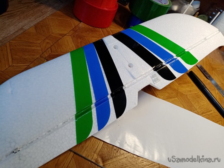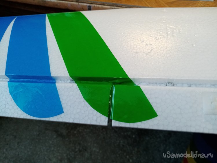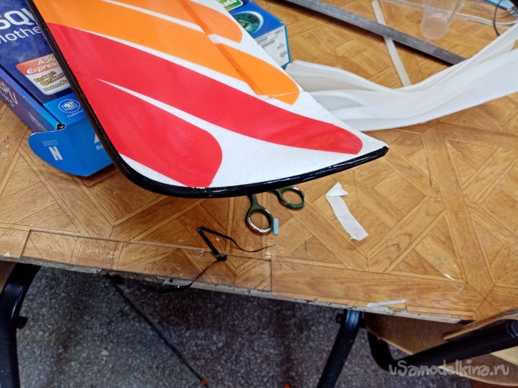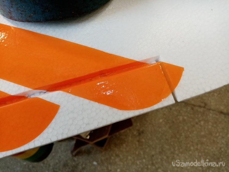 Оранжевая полоса пришлась на окончание элерона. Разрезаю скотч.