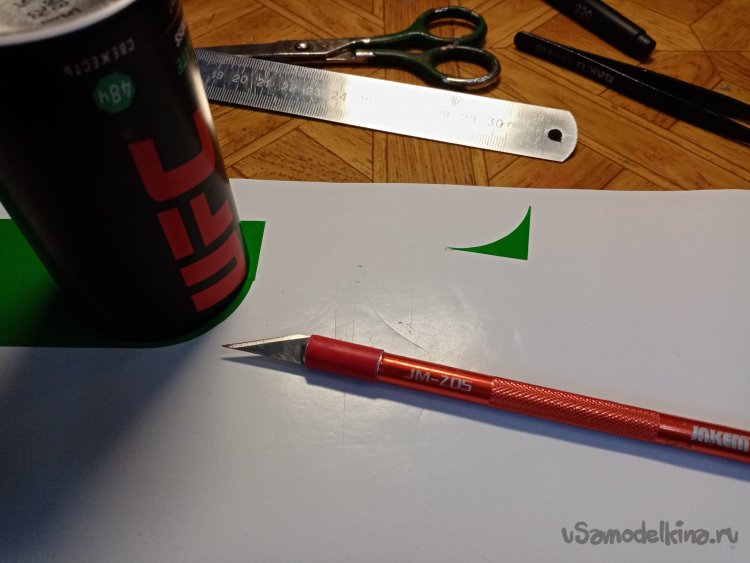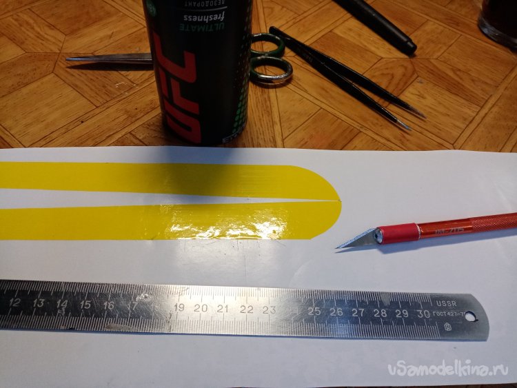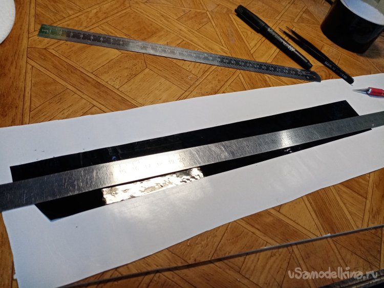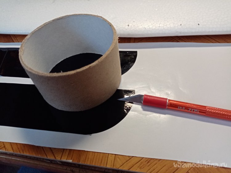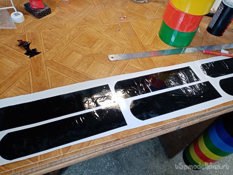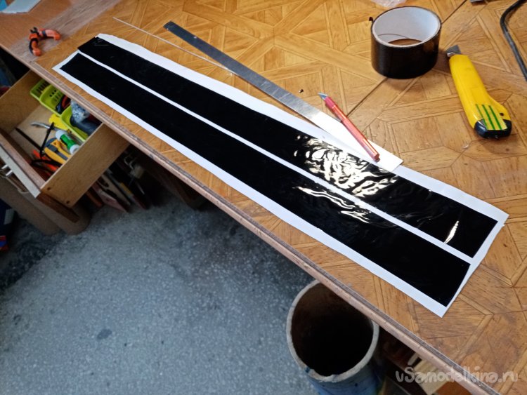 Принял решение заклеить нижнюю плоскость крыла полосками черного скотча. Приготовил полосу подложки от рекламной пленки. Подложка с оной стороны покрыта пластиком, к которому плохо прилипает скотч. Поэтому нет проблем наклеить полоску и снять ее. Края полосок закругляю, использую в качестве шаблона баночку с подходящим диаметром. По ней режу скотч простым ножом для творчества с треугольным лезвием.
