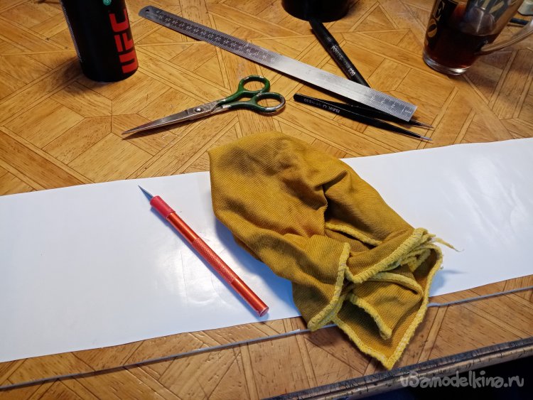 При раскручивании и отрезании полоски от рулона, всегда загибаю немного свободный кончик. Если она приклеится к рулону, весьма трудно оторвать его по новой. Поскольку рудер у меня небольшого размера. Разрезаю полоску вдоль и намного сужаю к одному краю.