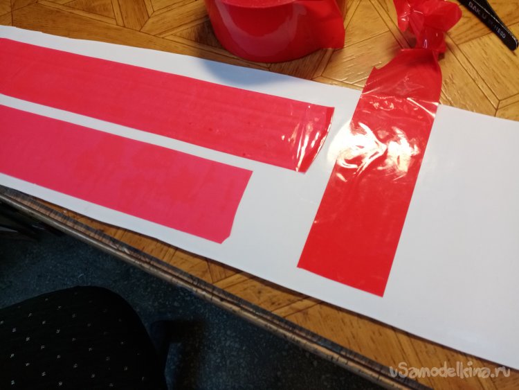Встал вопрос выбора оттенков красного скотча. Наклеиваю несколько образцов рядом. Выбираю вариант вертикальный, он краснее остальных.