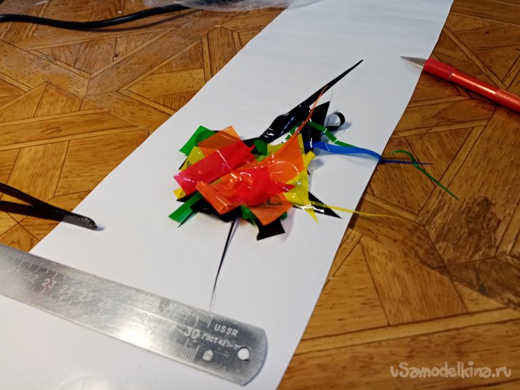 Готовы несколько полосок. Без особого труда снимаю их с подложки и наклеиваю на нижнюю сторону крыла.