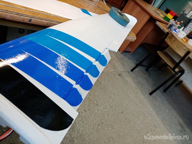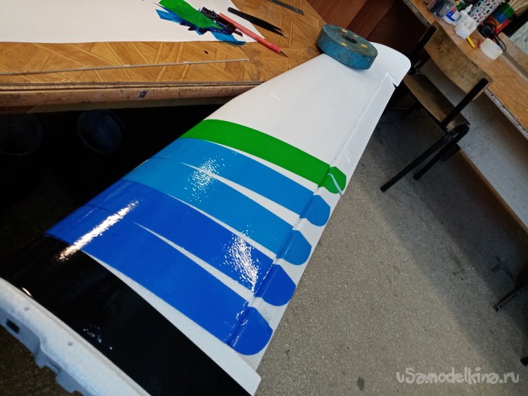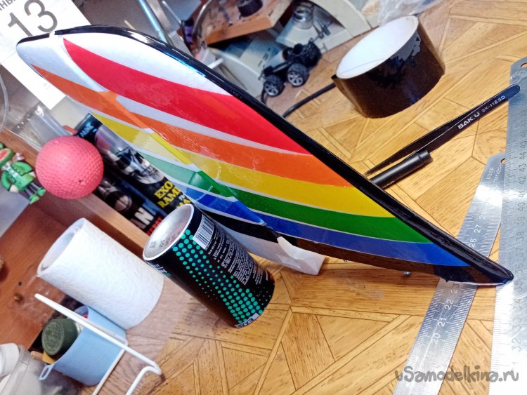 Начинаю с черной полоски, затем досадная ошибка. Наклеил голубой скотч. Пришлось снять. Исправил досадную оплошность. Сначала идут полоски цвета ультрамарин, затем небесно-голубой. На фото видно как для наклейки полосок скотча на перегиб рулевых поверхностей отклоняю их в нижнее положение.