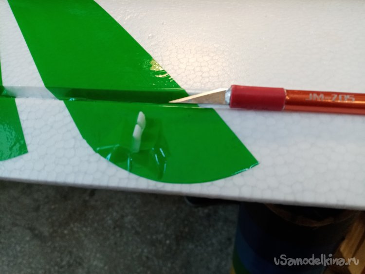 Перышко скотча травяного цвета попалось на стук флаперноа и элерона. Разрезаю в этом месте.