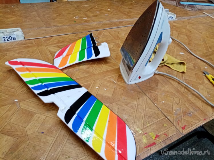 После окончания всех приклеек нужно «приварить» скотч к пенопласту. Для этой цели использую обыкновенный утюг. Предварительно на опытных образцах подобрал температуру. На грани плавления скотча. Для устранения ошибок, фломастером отметил положение движка контроля температуры на корпусе утюга. Начинаю как всегда с маленькой поверхности элеватора.