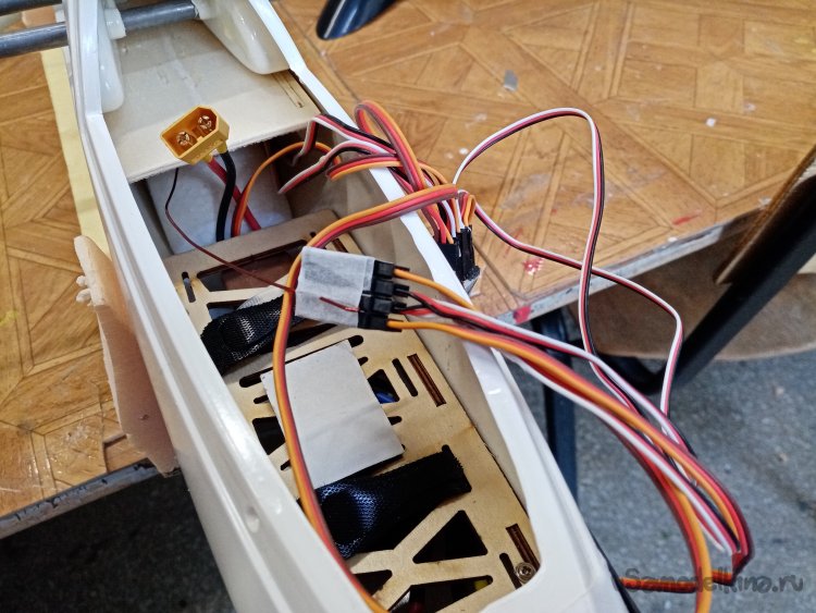 Подошел и его черед встать на крыло. Не торопясь заказал оборудование. Поскольку получил в режиме «без никто». А конкретно пустой корпус. Этой зимой все сложилось, оборудование поступило. Установил двигатель, регулятор, сервоприводы и приемник. Можно лететь. Но погода нас не балует. То снег, то ветер.