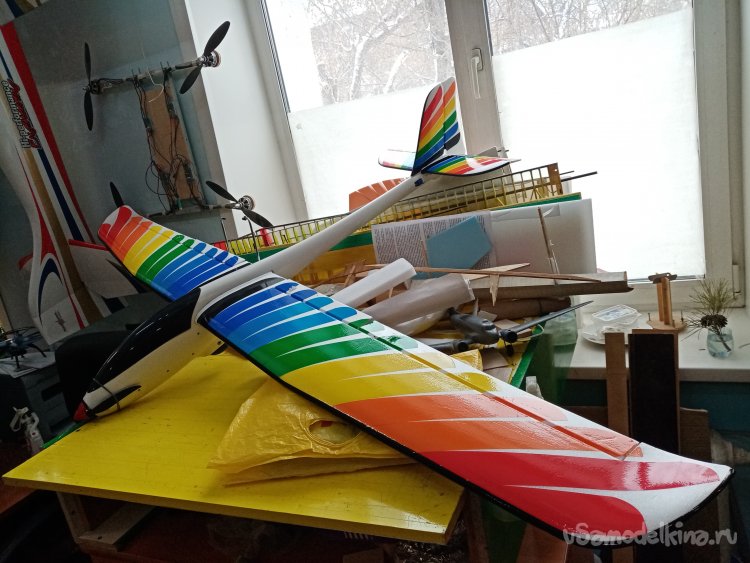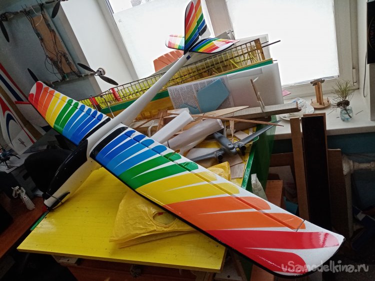 Раскрасить да поярче. Хотя среди моделистов существует поверье, что сначала самолет нужно облетать, настроить и в последнюю очередь раскрашивать. Но я не придерживаюсь такого мнения. И вообще анархист индивидуалист по убеждениям. Да и простой по случаю гадской погоды расслабляет.
