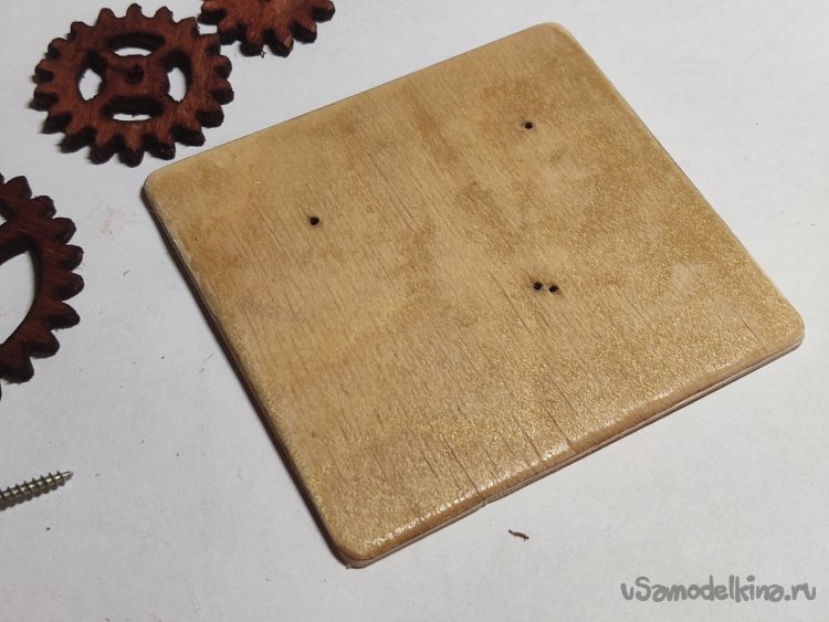 2) Вторую шестерню как и первую нужно будет покрыть морилкой. В принципе, можно поиграть с тоном. Так как вторая деталь будет располагаться по центру, её можно сделать более светлой , то есть нанести меньшее количество слоёв морилки. (это на любителя). Мне же нравится целостность декорации, поэтому покрою все детали одинаковым количеством слоёв морилки.