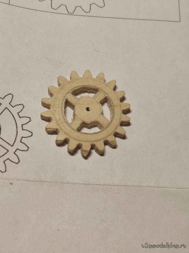 2) Выпиливаем зубчики у первой деревянной шестерни, здесь самое главное не спешить, делать ровно и спокойно , в спешки, из за мелочности изделия, можно отпилить что-нибудь не так и потратить силы и время впустую .