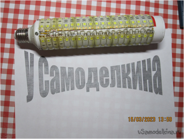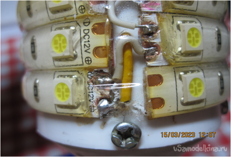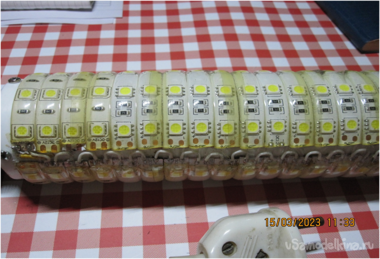 Я крепил ленту в силиконе т.к использую лампу как переноску. Если использовать в качестве замены лампы накаливания , то можно использовать ленту IP 20 ( без зашиты ).Если вы планируете использовать Б.П. на 12v то можно просто намотать ленту на цилиндр. Я подключил ленту на 220v. Для этого я разрезал ленту на 19 отрезков, L – по длине окружности тубы, и подключил, через выпрямитель , на сетевое напряжение 220v. Это избавило меня от блока питания. Отрезки ленты подключал последовательно, чтобы на каждом отрезке падение U бы до примерно 12v. Имейте в ввиду, что при таком включении на ленте нет гальванической развязки от сети. Поэтому я использовал ленту в силиконе.