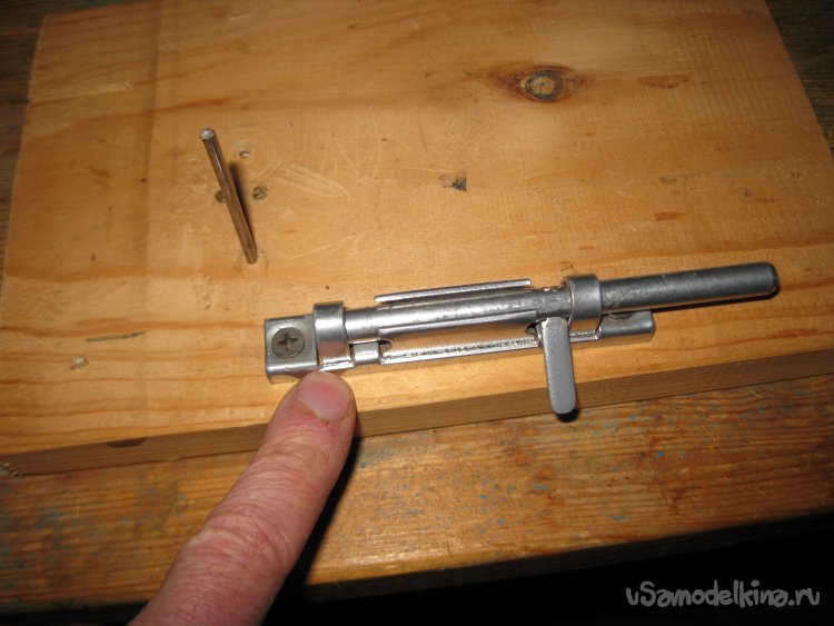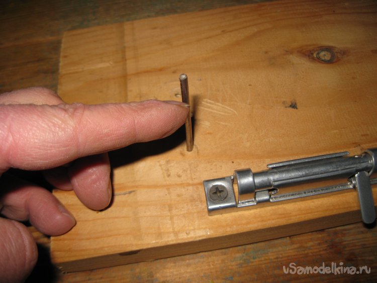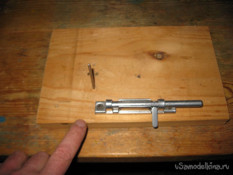 Для того чтобы его сделать, я прикрутил к небольшому обрезку доски, обычный шпингалет.
