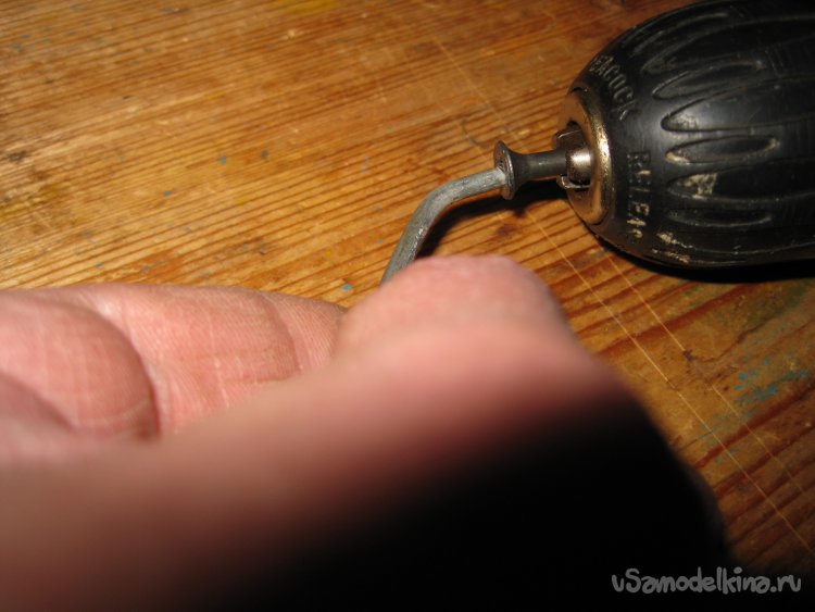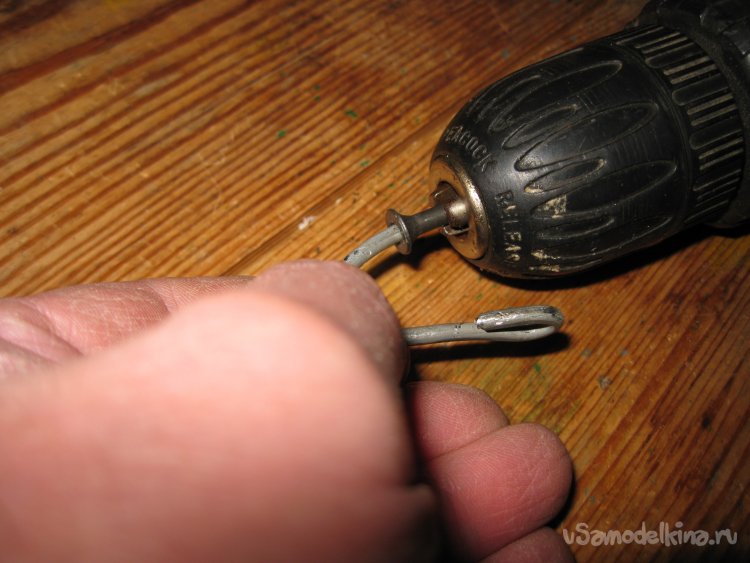 Я для этой цели, применяю изготовленный мной ранее, специальный инструмент для скругления концов проволоки (смотри статью: Самодельный инструмент для притупления острых кромок на концах проволоки), сделанный из черного шурупа по дереву.