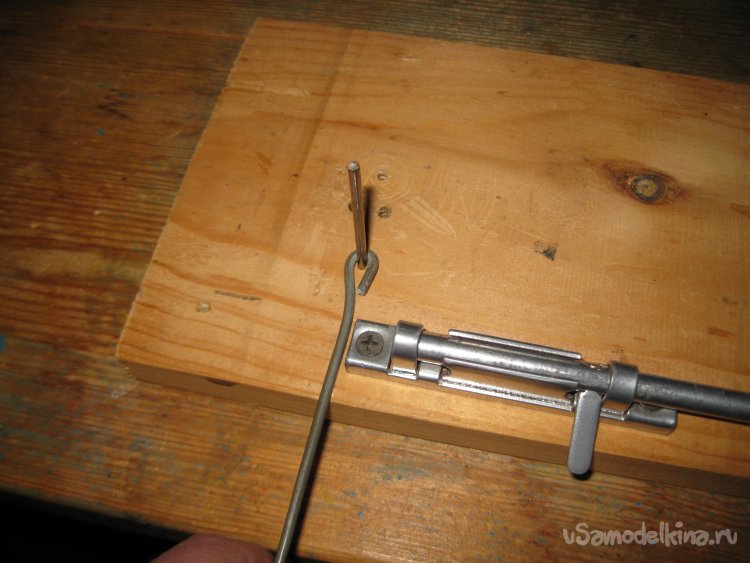Затем передвигаем шпингалет, чтобы он находился над проволокой.