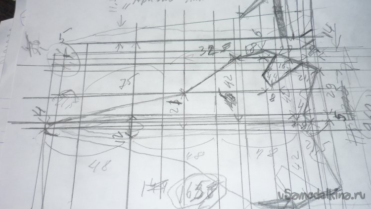 Прямо на потолочке размечаю контуры деталей и вырезаю. Что бы получить основную, несущую плоскость, на которую будут монтироваться все детали, мне пришлось вырезать 10 заготовок.