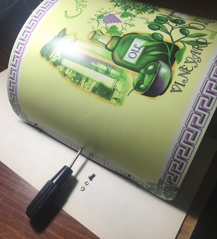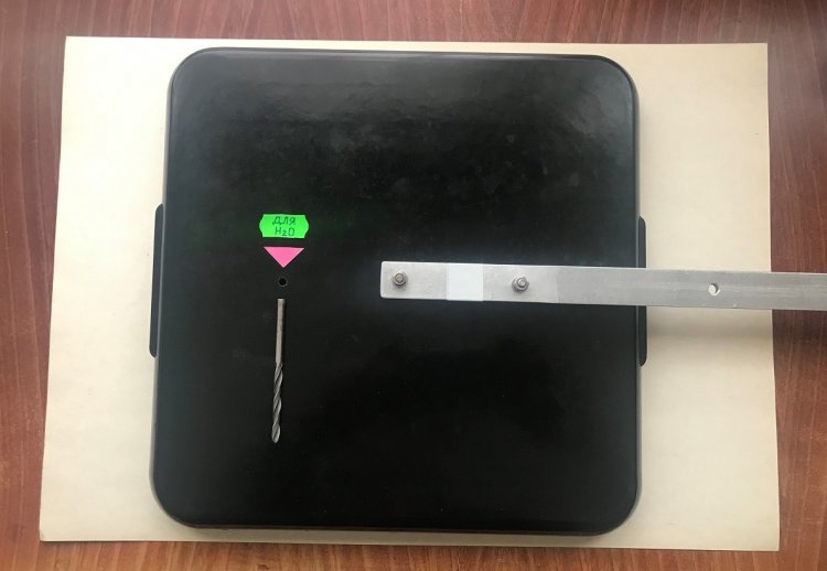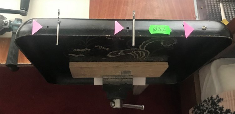 Накернивать центры будущих отверстий в подносе было опасно из-за вероятности растрескивания. Поэтому центры отверстий намечались процарапыванием линий штангенциркулем и шилом. Углубления в местах пересечения линий получились не большими, и чтобы отверстия не сместились от центра, сверление делалось в два этапа. Под винты М3 - сначала остро заточенным сверлом меньшего диаметра (1,4 … 2,0 мм), а затем сверлом 3 … 3,3 мм. Такие отверстия (по 3 штуки) с двух противоположных сторон, предназначены для винтового крепления козырька - салфетки.