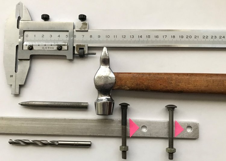 На рисунке 06 показана последовательность нанизывания на винты М4 (скрепляющие дюралевый держатель и монолитный поднос) шайб, шайб пружинных и гаек. В отверстие диаметром 6,0 мм продевается и завязывается страхующий тросик – гипотенуза. Штангенциркуль, предназначенный для разметки центров отверстий, можно заменить линейкой и чертилкой.