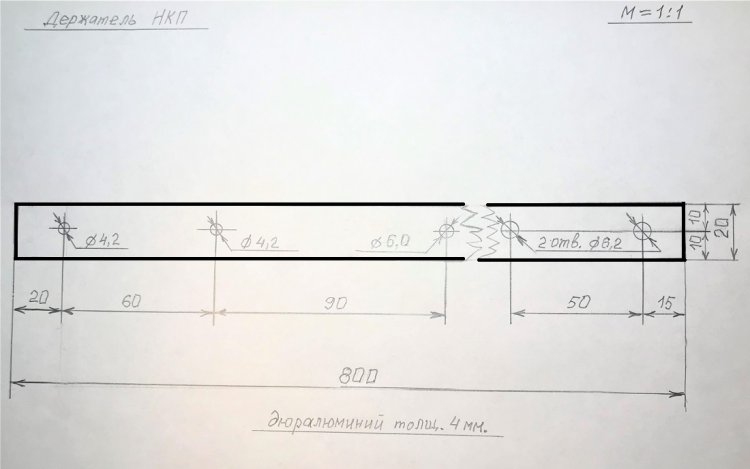 Для выноса НКП на 0,5 … 0,8 метра за пределы лоджии (балкона) используется держатель - полоска дюралюминия размерами 800 х 20 х 4 мм. Балконный конец полоски (см. рисунок 05) имеет два крепёжных отверстия под болты М6х60 мм.