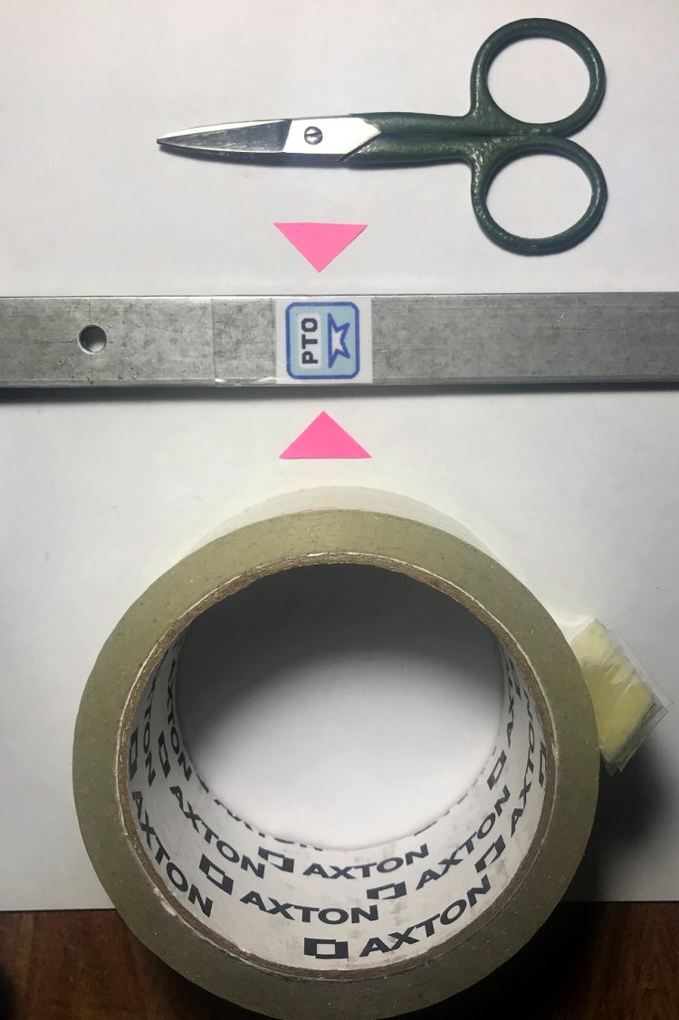 Распечатанная этикетка «РТО» вырезается из листа бумаги с небольшим припуском обычными ножницами и крепится к держателю двумя оборотами скотча шириной 48-50 мм.