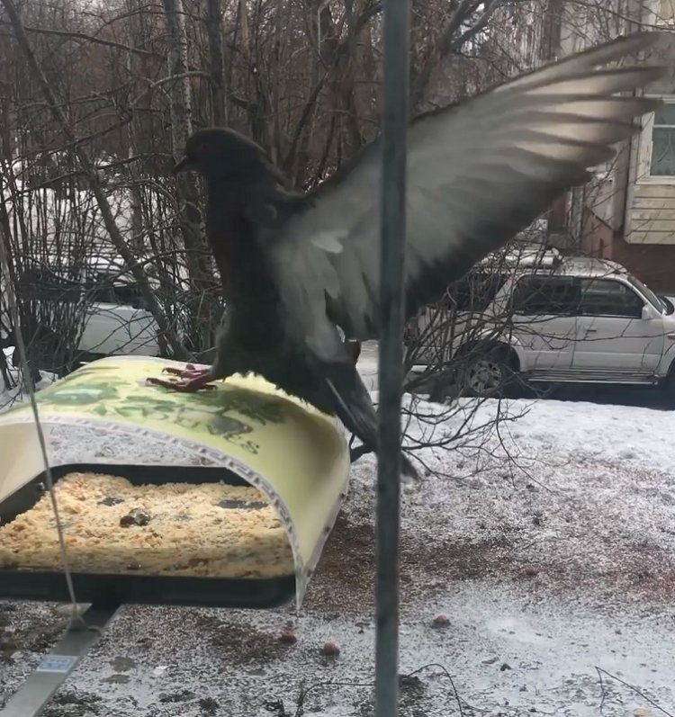 Проверка НКП на прочность. А сидящий под козырьком другой голубь не сможет получить травму, даже если соискатель завтрака сверху сильно постарается.
