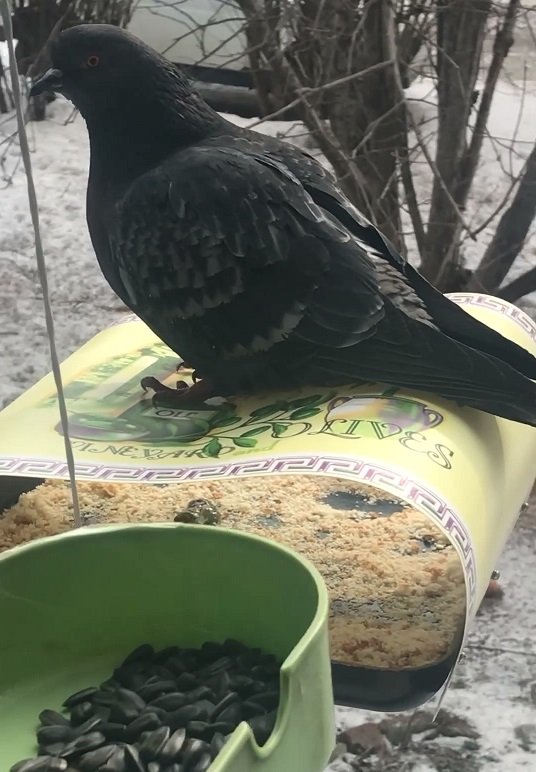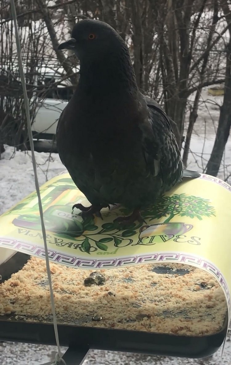 Проверка семечками. Главное для голубя – зафиксировать верховенство на кормушке перед другими птицами. В случае успеха, семечки от Главного голубя на кормушке никуда не денутся.