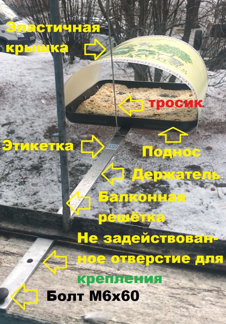 Для лучшего восприятия статьи, основные детали кормушки подписаны на рисунке 15: Эластичная крышка (козырёк). Тросик (страховка от падения). Этикетка. Поднос (Основание). Держатель. Балконная решётка. Болт.