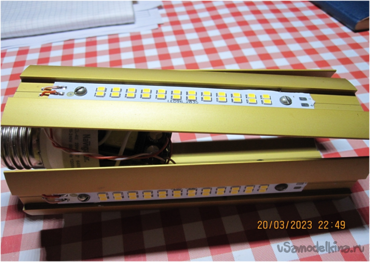 5. Внутрь корпуса от энергосберегайки, на термоклей ставим 2 блока питании( стабилизаторы тока на 350 мА; 15 Вт , по 1 шт. на 2 отрезка от линейки).