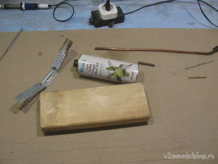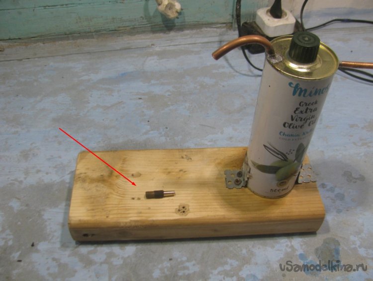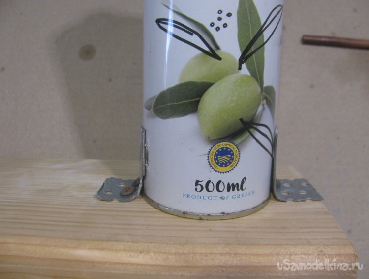 В качестве основы для генератора используется узкая и высокая банка от масла. Чтобы это дело не падало, нужно закрепить банку. Подойдет доска или тяжелый брусок. Делаем крепления из жести или любых полосок металла и припаиваем к банке. Ну а далее приспособу можно надежно прикрутить к бруску саморезами. Если используется деревянный стол, можно это дело стационарно закрепить прямо на столе.