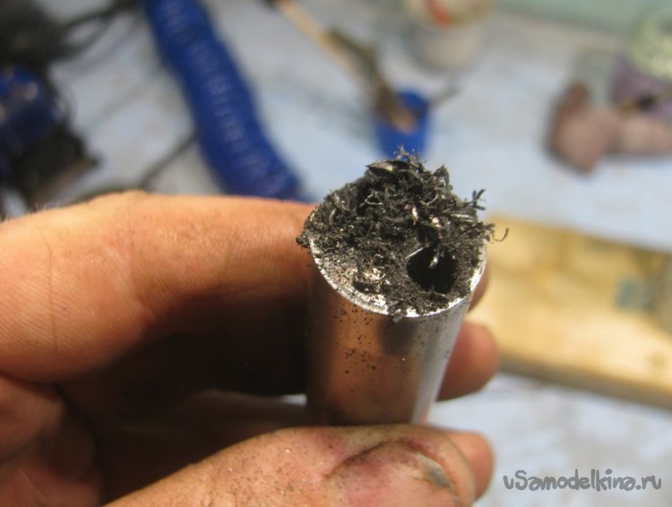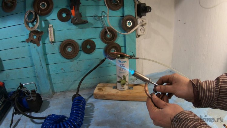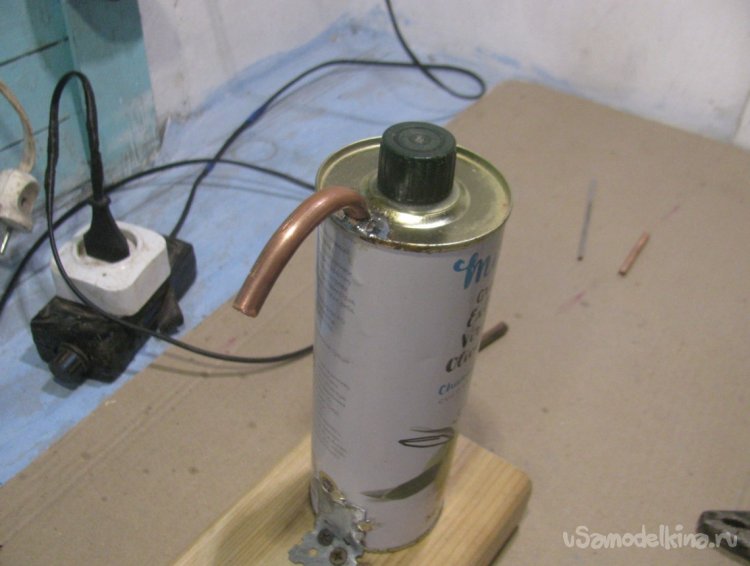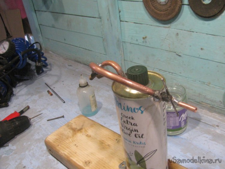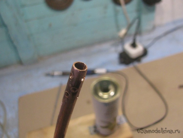 Первым делом подготовим входную трубку, он должна доходить до дна банки. Я также насверлил на конце трубки отверстий, чтобы выходили пузырьки воздуха поменьше. Чем больше пузырьков, тем больше бензина с воздухом будет поступать к горелке.