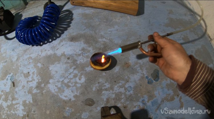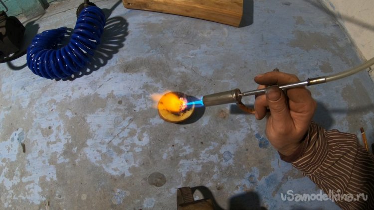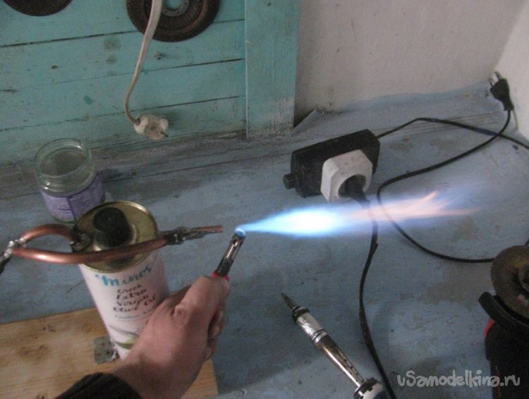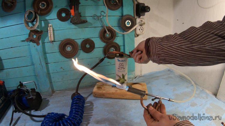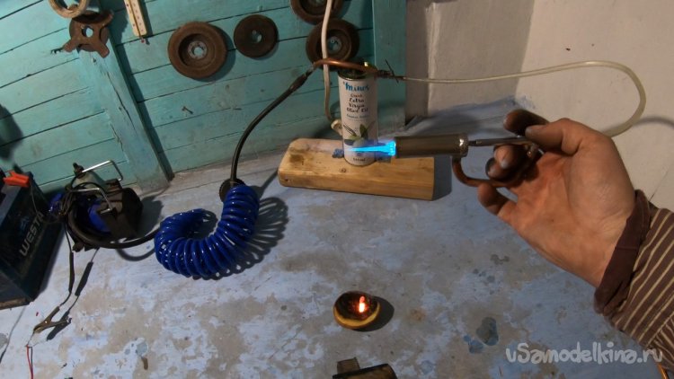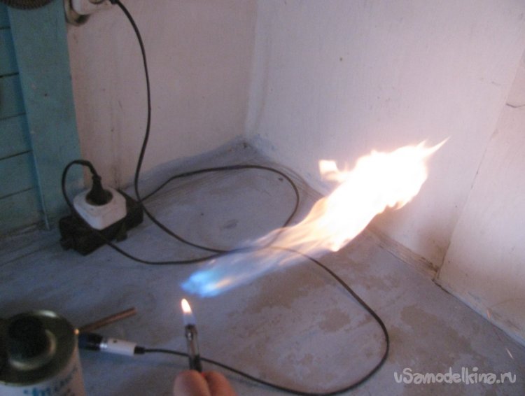 Компрессор в самоделке работает не на всю мощность, он включен через резистор. Если включить на всю скорость, пламя просто сдувается, тут уже нужна другая горелка, но мне пока хватит этой.