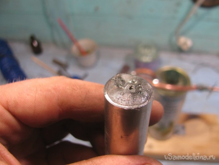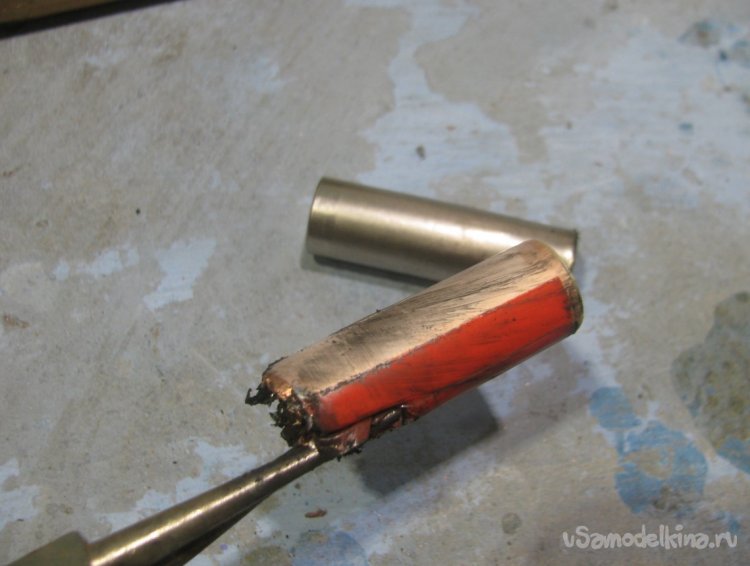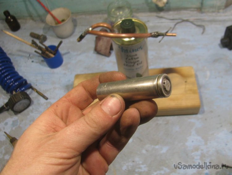 Просто так на конце трубки струя газа гореть не будет, ей нужен предварительный поджиг у основания, для этого и делается горелка. В качестве корпуса я решил применить аккумулятор 18650, он из какой-то интересной стали, которая легко паяется, при этом не ржавеет и хорошо держит температуру.