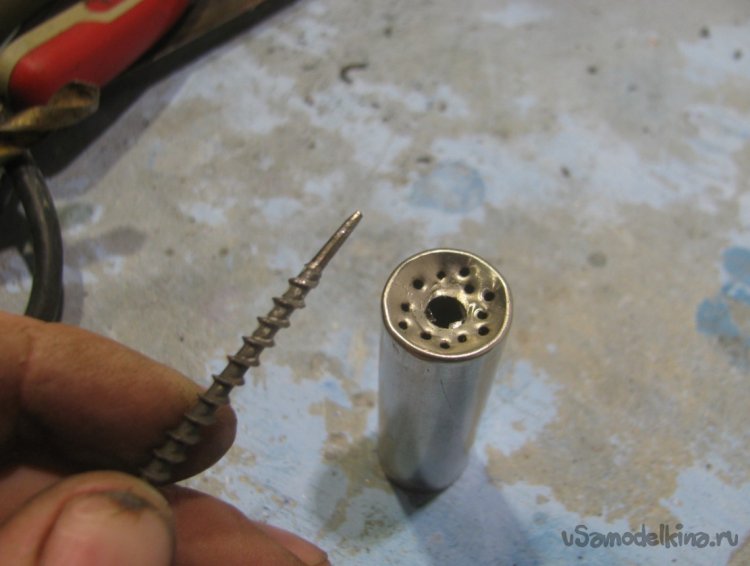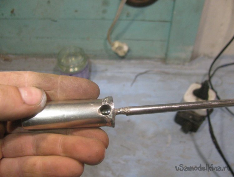 Вставляем трубку от антеннки, с обратной стороны припаиваем все это дело через монетку. В завершении нам нужно сделать еще одну трубку в виде буквы «U» с регулировочным винтом. Таким образом мы сможем регулировать подачу газа между мелкими отверстиями и основной центральной трубкой. Вот и все, теперь горелка полностью собрана и можно переходить к испытаниям.