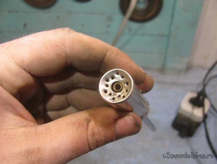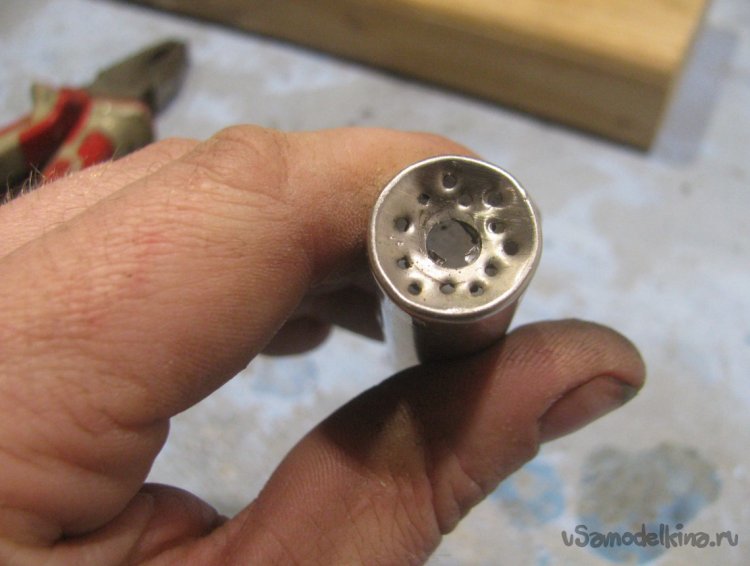 В дне батарейки сверлим центральное отверстие под трубку, а также пробиваем или сверлим ряды отверстий. Донышко у меня в итоге «провалилось» внутрь и это нам на руку, так горелка будет работать более качественно.