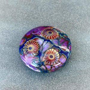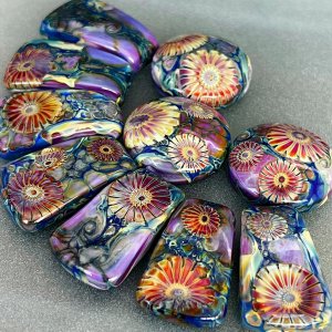 Ах вот вы чем занялись. Это т. н. лэмпворк. Бусины на спице. Некоторые приплюснутые. Нужны специальные палочки цветного стекла (с одинаковым КТР), кислород - многие стекла окрашены окислами и те восстанавливаются в восстановительном пламени, кое-какие инструменты. Цветочки - т. н. "мурини", муранское стекло. Специальная техника, когда изображение в сечении создавалось, набиралось из прутиков цветного стекла, они сплавлялись в единый стержень и вытягивались. При этом рисунок масштабировался. Готовой стержень накалывался на небольшие шайбочки и им украшали стеклянные работы. При плавлении они расплываются и получается мелкий, но красивый рисунок, обычно - цветы. Сейчас часто продаются готовые шайбочки-мурини.