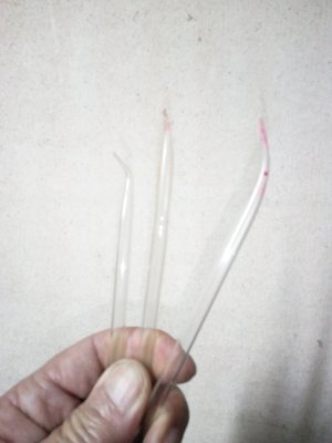 Раньше в канцелярском магазине продавались такие рейсфедеры с оттянутым кончиком. Иногда прямые, иногда с выдутым чуть выше сужения пузыриком для туши. Для удобства работы предлагалось чертежнику самостоятельно отогнуть тонкий кончик чуть набок - в пламени спички. Отжига здесь конечно никакого не нужно - очень маленькие размеры и толщина, напряжениям негде разгуляться. Такими стекляшками тоже чертили в юности дорожки лаком. У меня до сих пор запах ацетона которым стирали лак с готовых плат, ассоциируется с каким-то радостным предвкушением - сейчас появится медный рисунок! Парочка таких фабричных ностальгических рейсфедеров у меня и сейчас есть.