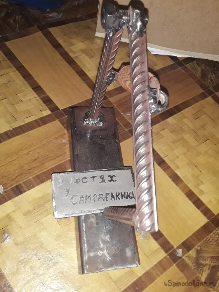 Далее для рычага взял два куска арматуры 15см и 10см устанавливаю их по угольнику под прямой угол и привариваю после сварки на наковальне подбиваю сварочные швы.