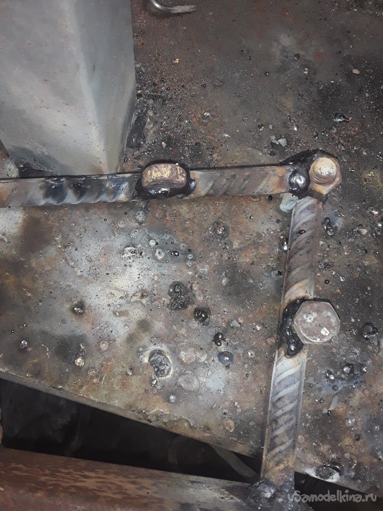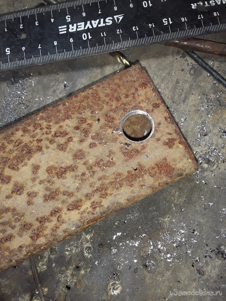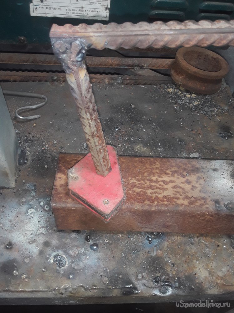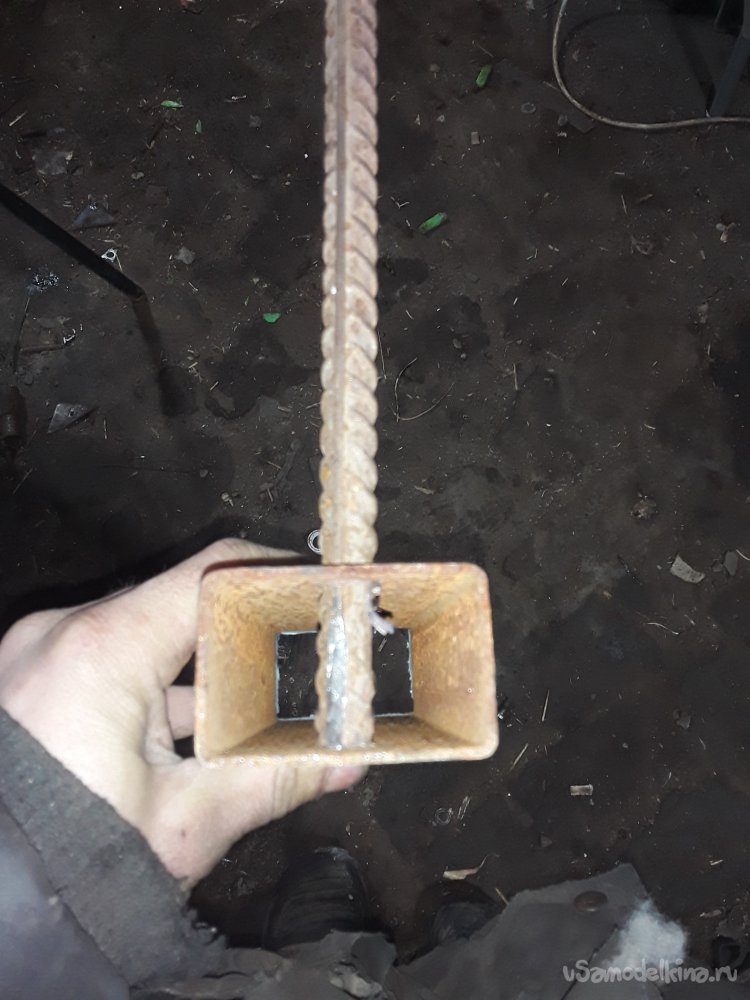 Для основания я взял профильную трубу с толщенной 2мм, для того чтобы усилить конструкцию я решил приварить арматуру в двух точках. Для этого отступил от края 2см и просверлил отверстие 9мм для того чтобы можно было арматуру плотно вставить и приварить изнутри и снаружи. Для более плотного контакта на арматуре от края сточил все ребра затем установил арматуру в отверстие и приварил в двух точках.