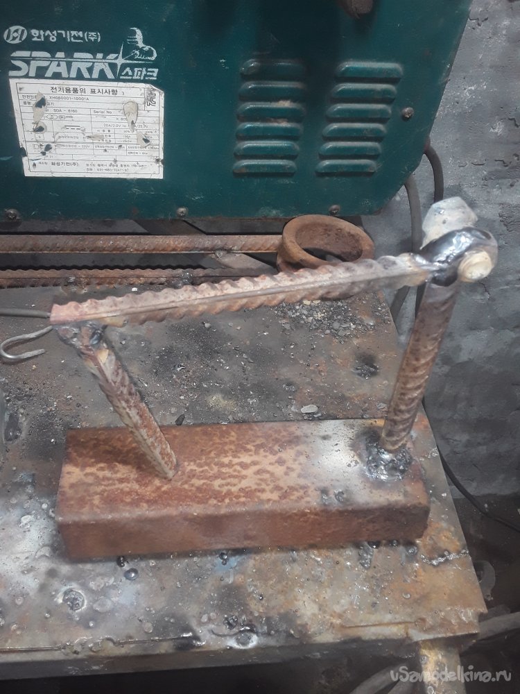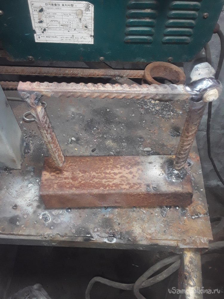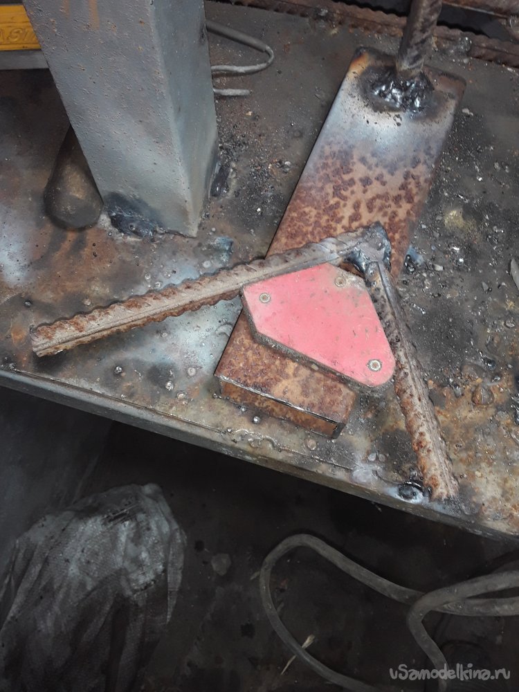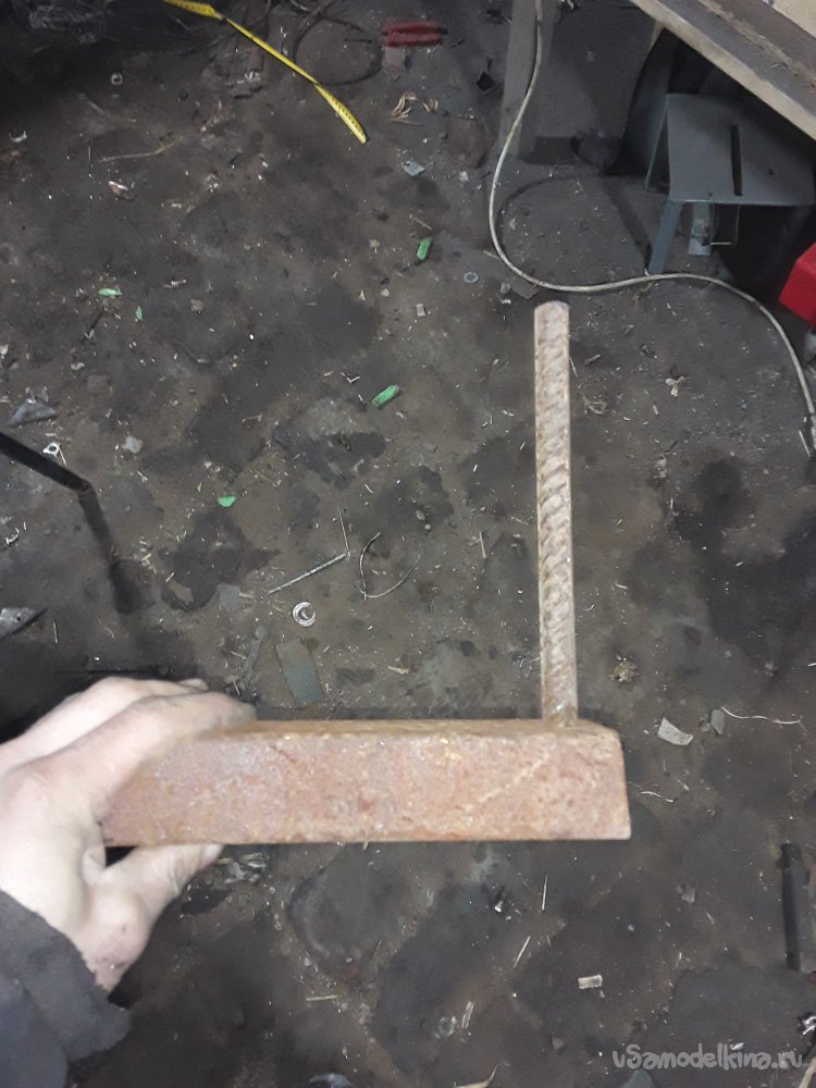 Для основания приспособления нужно использовать лист металла если нужна постоянно куда-то переносить приспособление в общем нужна мобильность. Если приспособление не нужно некуда переносить можно просто сразу приварить саму стойку без площадки к сварочному столу где-нибудь на углу в сторонке чтобы не мешался, но это если метал стола толстый иначе все рано или поздно поведет. Основание у моего сварочного стола уже все старое и потрепанное жизнью. Каркас стола сварен из квадрата 40мм на 40 мм к нему я и буду приваривать свое приспособление так как сварочные работы произвожу в одном месте. Для основания приспособления я взял кусок профильной трубы 50мм на 40мм длинной 20см. Для скелета взял и отрезал от куска арматуры 10мм 3 куска разной длинны это 18см для основания, 15см для рычага и 10см для контакта удержания.