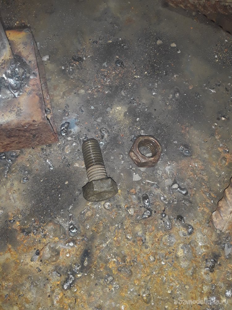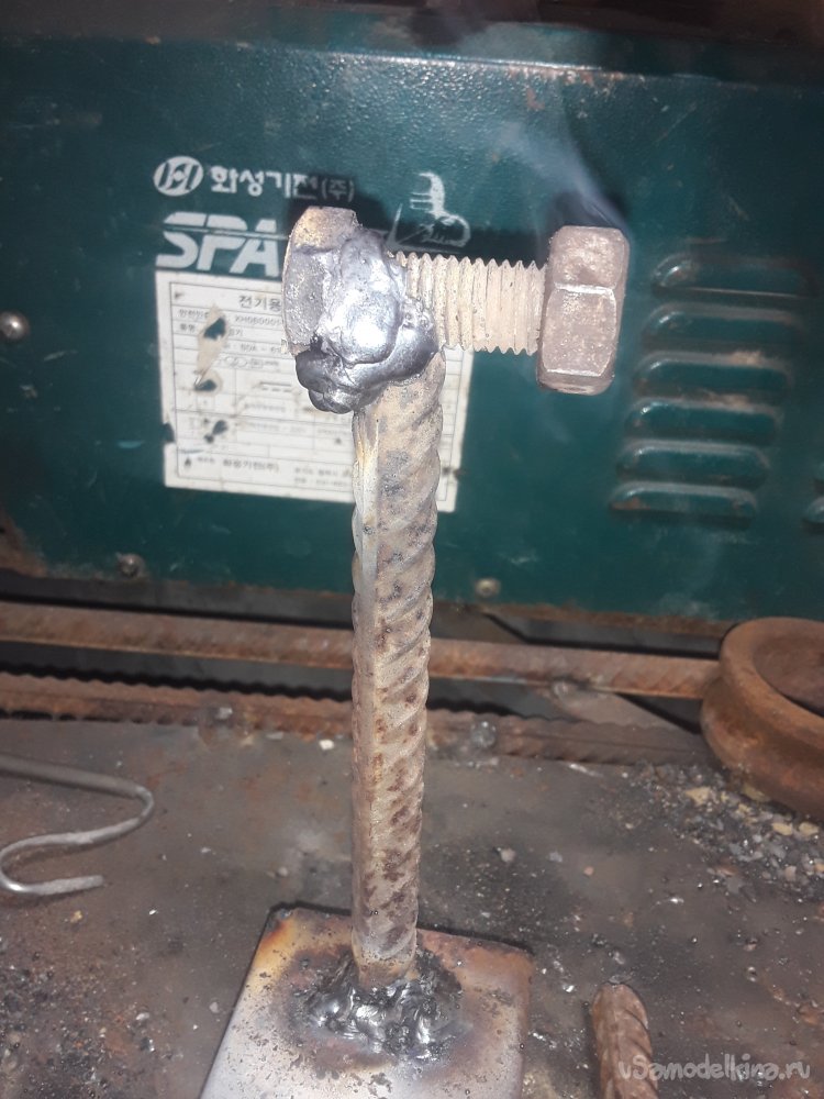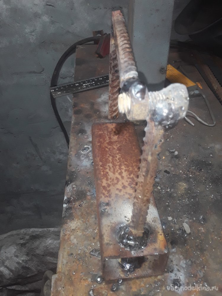 Для шарнирного соединения взял болт с гайкой м8 длинной 2см главное чтобы гайка сидела плотно на болте и не было большого люфта иначе при плохом контакте может искрить и сварить шарнир, но это не точно. Устанавливаю болт поперек арматуры сверху и привариваю и немного навариваю ребра жесткости аккуратно чтобы не испортить резьбу. Далее накручиваю гайку на приваренный болт и на грань гайки устанавливаю рычаг немного смещая в сторону к центру профиля так как из-за болта немного произойдет смещение на край. При сборке мне нужно было просверлить отверстие не в центре, а ближе краю профиля тогда при сварке болта потом рычаг бы оказался в центре ну это не беда и так все будет работать как нужно. После того как приварил рычаг проверяю на прочность швов и даю остыть не проворачивая рычаг иначе на горячую метал мягкий и можно испортить резьбу.
