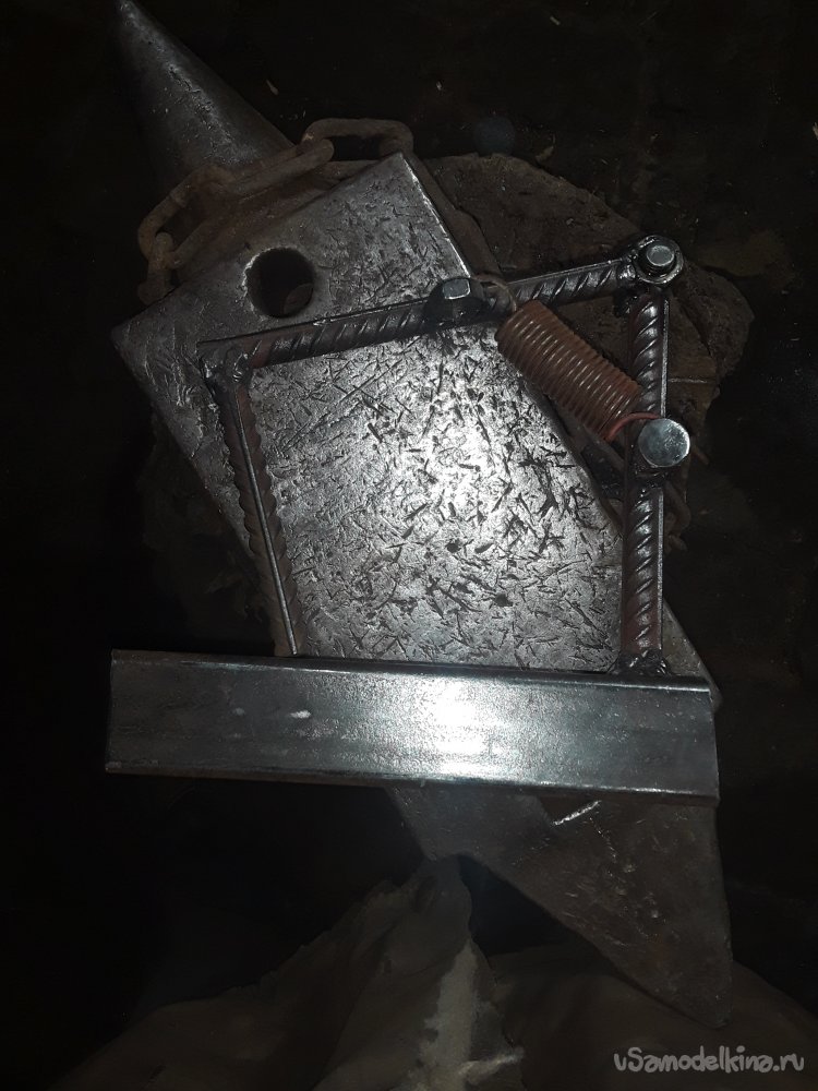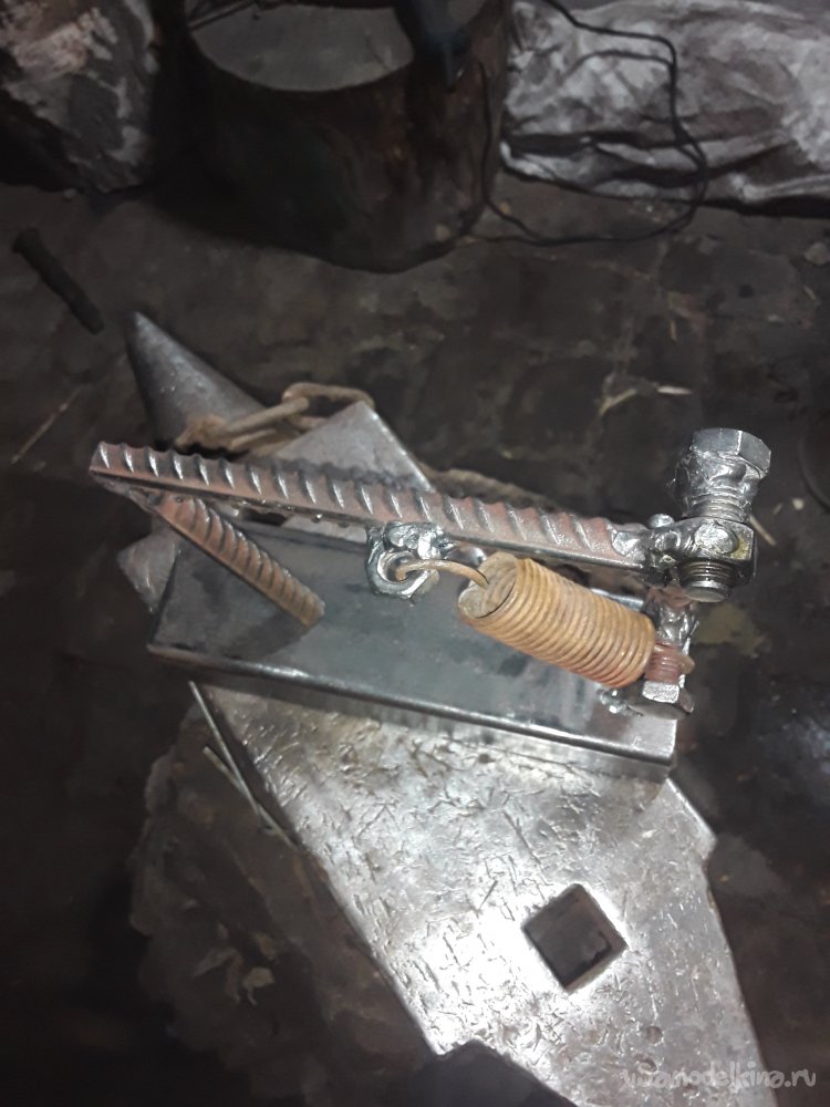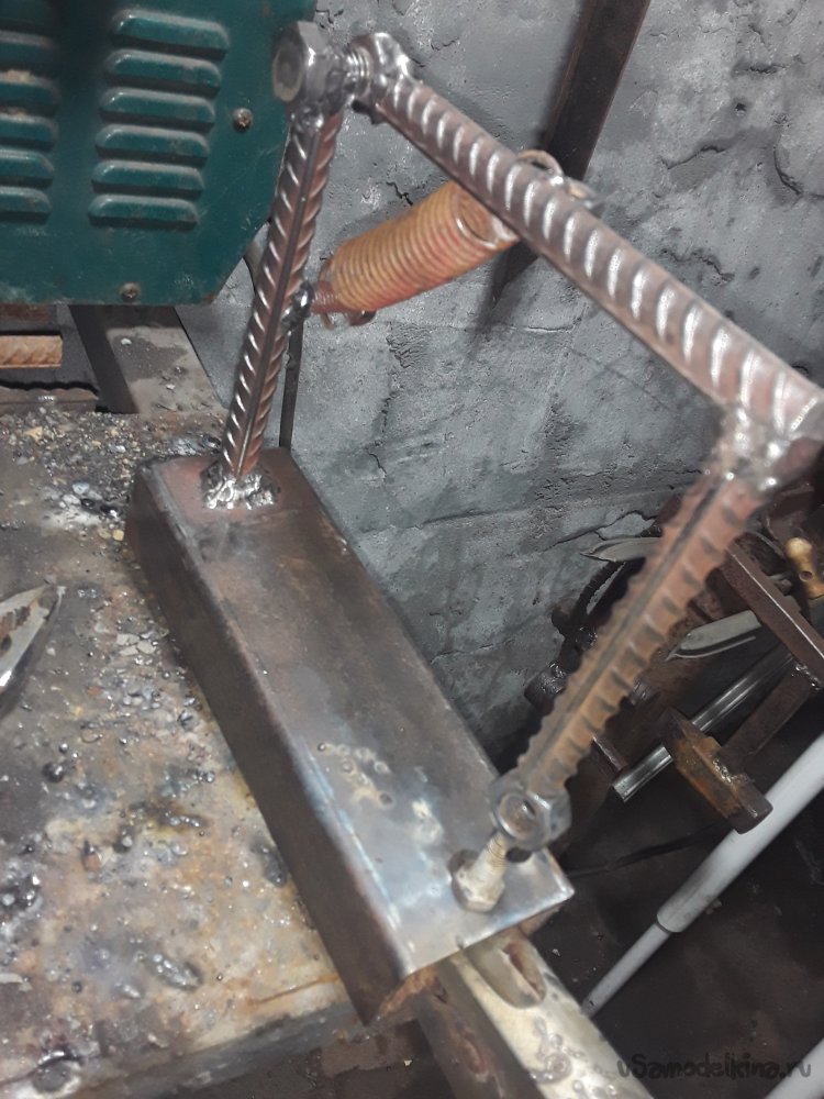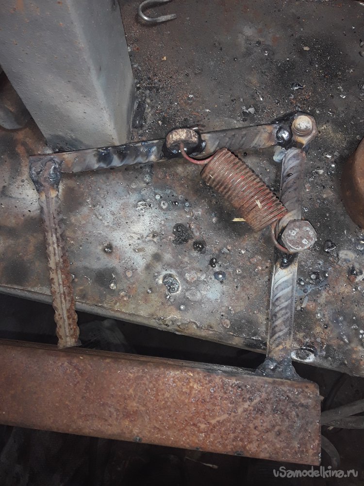 Ну вот и все почти готово такое соединение получается крепким и без люфта, а самое главное, что всегда можно исполнить. Острие контакта я не стал изменять обычно по советам его заостряют, но я думаю так контактное пятно будет маленьким да и держать будет неплотно. По этому я просто немного отшлифовал края и оставил контакт плоским. Далее для того чтобы механизм работал нужна жесткая пружина я долго искал, но нашел подходящую. Такая пружина у меня стояла на подножки ненужного прицепа на растяжение она упругая, но не очень длинной примерно 5см, а диаметром 20мм. И взял еще одну пружину от педали сцепления ваз, но она мне не подошла длинной и жесткостью она ее тяжело разжимать и в друге она отстрелит и деталь еще и горячая прилетит туда где опасно. Для ее крепления я взял болт с гайкой м6 длинной 3см болт выставил на бок стойки и заварил, а гайку приварил на бок рычага. Перед сваркой проверил чтобы пружина была немного натянута в нерабочим положении так будет придавливаться намного сильнее более тонкие детали.